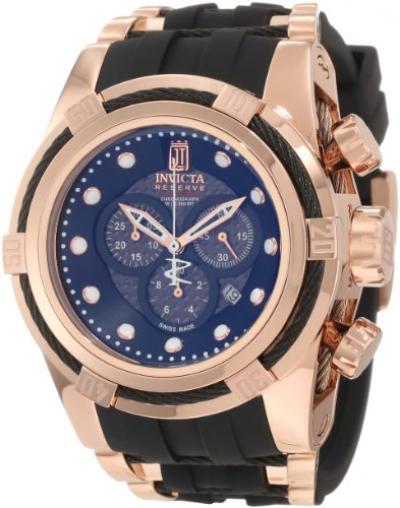 Rose gold-tone stainless steel case with a black rubber strap. Fixed rose gold-tone bezel with black cable wire trim. Black dial with rose gold-tone hands and dot hour markers. Minute markers around the outer rim. Dial Type: Analog. Luminescent hands and markers. Date display appears between the 4 and 5 o'clock positions. Chronograph - three sub-dials displaying: 60 second, 30 minute and 10 hour. Quartz movement. Scratch resistant flame fusion crystal. Screw down crown. Solid case back. Case diameter: 53 mm. Round case shape. Tang clasp. Water resistant at 200 meters / 660 feet. Functions: chronograph, date, hour, minute, second. Casual watch style. Watch label: Swiss Made. Invicta Jason Taylor Chronograph Black Dial Rose Gold-Tone Mens Watch 12956.