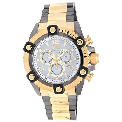 Stainless steel case with a two-tone (gumetal and gold-plated) stainless steel bracelet. Fixed gold-plated bezel. Platinum dial with luminous hands and index hour markers. Arabic numerals mark the 4, 8 and 12 o'clock positions. Minute markers around the outer rim. Dial Type: Analog. Luminescent hands and markers. Date display at the 4 o'clock position. Chronograph - two sub-dials displaying: 60 second and 30 minute. Day of the week sub-dial at the 9 o'clock position. Quartz movement. Scratch resistant flame fusion crystal. Screw down crown. Solid case back. Case diameter: 56 mm. Case thickness: 19 mm. Round case shape. Band width: 31 mm. Band length: 9.25 inches. Deployment clasp. Water resistant at 200 meters / 660 feet. Functions: date, day, 24hour, minute, second. Casual watch style. Invicta Reserve Chronograph Platinum Dial Two-tone Mens Watch 15837.