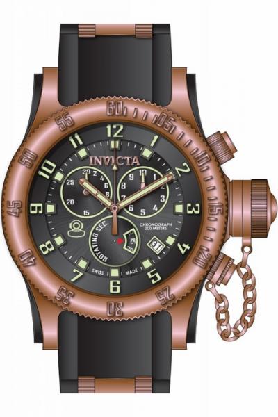 Rose gold ion-plated stainless steel case with a black polyurethane rubber strap with rose gold ion-plated accents. Uni-directional rotating rose gold ion-plated bezel. Black dial with luminous rose gold-tone hands and Arabic numeral hour markers. Minute markers. Dial Type: Analog. Luminescent hands and markers. Date display between 4 and 5 o'clock positions. Chronograph - three sub-dials displaying: rotating second, 30 minute and 1/10th of a second. Quartz movement. Scratch resistant flame fusion crystal. Pull / push crown with canteen cap. Solid case back. Case diameter: 52 mm. Round case shape. Band width: 26 mm. Band length: 8.25 inches. Tang clasp. Water resistant at 200 meters / 660 feet. Functions: chronograph, date, hour, minute, second. Casual watch style. Invicta Russian Diver Chronograph Black Dial Black Polyurethane Mens Watch 15567.