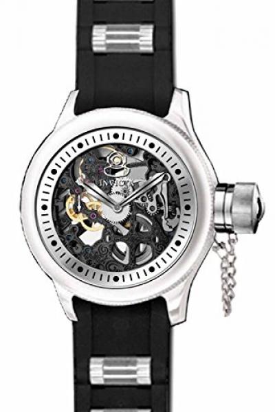 Stainless steel case with a black polyurethane strap with stainless steel accents. Fixed stainless steel bezel. Silver / black skeleton dial with luminous silver-tone hands and dot hour markers. Minute markers around the outer rim. Dial Type: Analog. Luminescent hands. Seconds sub-dial at the 9 o'clock position. Mechanical movement. Scratch resistant flame fusion crystal. Pull / push crown with canteen cap. Skeleton case back. Case diameter: 51.5 mm. Round case shape. Band width: 26 mm. Band length: 8.85 inches. Tang clasp. Water resistant at 50 meters / 165 feet. Functions: hour, minute, second. Casual watch style. Invicta Russion Diver Black Skeleton Dial Black Polyurethane Mens Watch 17263.