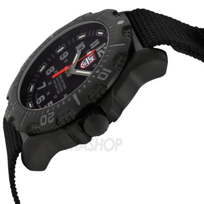 Brushed stainless steel case with a black nylon bracelet. Uni-directional rotating carbon reinforced polycar bezel. Black dial with luminous hands and Arabic numeral hour markers. 24 hour markers. minute markers around the outer rim. Dial Type: Analog. Luminescent hands and markers. Date display at the 3 o'clock position. Quartz movement. Scratch resistant sapphire crystal. Solid case back. Case diameter: 45 mm. Case thickness: 13 mm. Round case shape. Band width: 23 mm. Tang clasp. Water resistant at 200 meters / 660 feet. Functions: date, hour, minute, second. Luxury watch style. Luminox Sea Anu 4200 Black Dial Black Nylon Mens Watch 4221.CW.