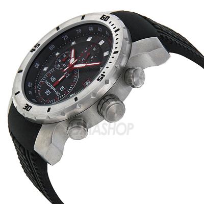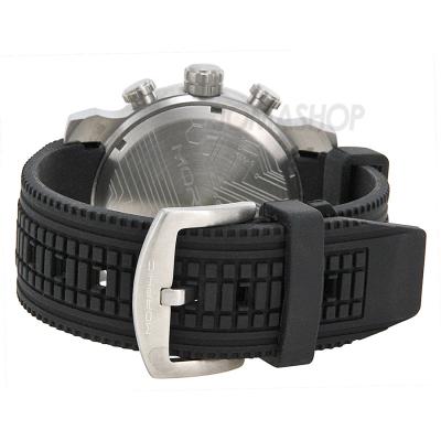 Stainless steel case with a black silicone strap. Uni-directional rotating stainless steel bezel. Black carbon fiber dial with luminous red hands and index hour markers. Minute markers. Tachymeter around the outer rim. Dial Type: Analog. Luminescent hands and markers. Date display at the 3 o'clock position. Chronograph - three sub-dials displaying: 60 second, 60 minute and 24 hour. Quartz movement. Scratch resistant mineral crystal. Screw down crown. Solid case back. Case diameter: 46 mm. Case thickness: 14 mm. Round case shape. Band width: 24 mm. Band length: 8.5 inches. Tang clasp. Water resistant at 100 meters / 330 feet. Functions: chronograph, date, hour, minute, second. Additional Info: tachymeter. Casual watch style. Morphic M25 Series Mens Watch 2602.