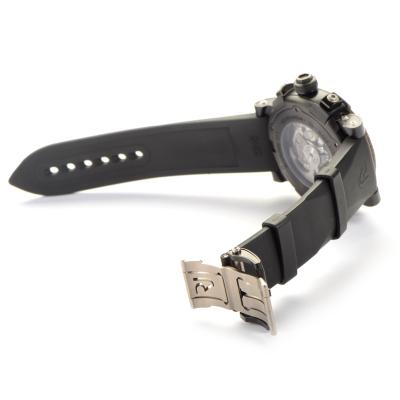 Black satin-finished stainless steel case with a black rubber strap. Stabilized Titanic extreme rusted bezel. Dial blackened with coal from the Titanic with skeleton hands. Roman numeral marks the 12 o'clock position. Minute markers around the outer rim. Dial Type: Analog. Date display appears at the 9 o'clock position. Chronograph - three sub-dials displaying: 60 second, 30 minute and 12 hour. Automatic movement. Scratch resistant sapphire crystal. Skeleton case back. Case diameter: 50 mm. Round case shape. Deployment buckle clasp. Water resistant at 50 meters / 165 feet. Functions: chronograph, date, hour, minute, second. Luxury watch style. Watch label: Swiss Made. Titanic-DNA is an exclusive and unprecedented collection, inspired by the legendary ocean liner the Titanic, which went down in the North Atlantic in 1912. Romain Jerome pays homage to the illustrious liner by making watches out of the actual materials recovered from the sunken Titanic. Romain Jerome Titanic DNA Automatic Chronograph Mens Watch CH.T.OXY3.BBBB.00.BB.
