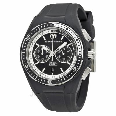 Stainless steel case with a black silicone strap. Unidirectional black and while aluminium bezel. Black dial with luminous hands and luminous stick hour markers. Minute markers around the outer rin. Dial Type: Analog. Luminescent hands and dial markers. Date displays at the 6 o'clock position. Two - 60 minutes and 24 hours. Quartz movement. Miyota fs23 quartz engine. Scratch resistant mineral crystal. Stainless steel screw down crown. Screw down case back. Case diameter: 40 mm. Case thickness: 13.5 mm. Round case shape. Tang clasp. Water resistant at 200 meters / 660 feet. Functions: hour/ minute/ second/ date/ chronograph. Sport watch style. Technomarine Cruise Sport Chronograph Unisex Watch 110015.