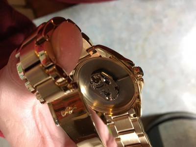 Gold toned ladies watch with tiger eye dial and gold indices. Model number 14502053 and case CA.67.7.34.0927 Gold minute, hour and second hands and quartz movement. Snap back and fixed bezel and etched with COACH NEW YORK around the face of the watch. The dial is amber in color but made of some textured amber mineral. The crown is a pull out and marked with a "C". The band is a gold tone linked stainless steel. Water resistant 3 ATM / 30 meters. Movement is market S Epson Corp JAPAN - no jewels 3 Y121E. Battery is a VARTA V376/v377