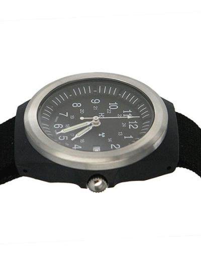 Traser Military (MIL-SPEC) Watch w/Tritium Lights (P5900 Type 3) P5900.506.33.11Built to Military standards, the P5900 fulfills the strict requirements of the DOD. As a proven, no-nonsense watch, it was worn in the gulf war by U.S. soldiers. It features a strong polyester case, stainless steel bezel and case back, non-branded black dial with 24 hour markings, mineral crystal, and a Swiss Ronda 505 quartz movement. Green Tritium lights are at each hour marking except for 12:00 which is orange. Hour and minute hands have green Tritium.