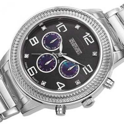 This handsome Men's August Steiner timepiece boasts a alloy case and bracelet with genuine diamond hour markers. The watch features a Swiss Quartz movement with sub dials displaying the day, date and GMT.